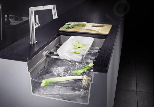 Dřez je vybavený dvěma posuvnými kolejničkami Etagon, kvalitním přepadem C-overflow®, manuálním sítkovým ventilem InFino® (nahrazuje tradiční sítko novým designem), odtokovou soupravou s prostorově úspornou trubkou. Můžete si k němu dokoupit dodatečně i drtič odpadu.