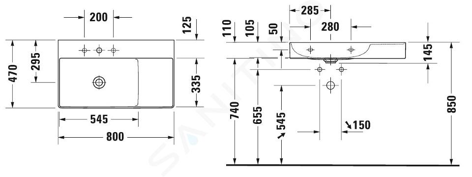 Závěsné asymetrické umyvadlo bez přepadu