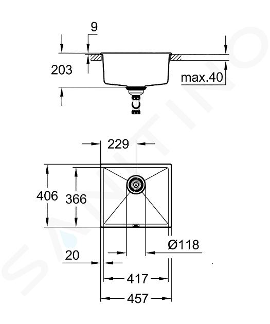 Kuchyňský dřez firmy Grohe je mimořádně odolný. Je totiž vyrobený z křemenného kompozitu té nejvyšší kvality. Výrobek ze série Grohe Dřezy dále zaujme speciální izolační vrstvou Grohe Whisper potlačující hluk a rychlomontážním systémem Grohe QuickFix. Dřez je vhodný pro horní i spodní montáž. Jeho mycí plocha má rozměry 417 x 366 x 203 mm, celkové rozměry dřezu jsou 457 x 406 mm. Balení obsahuje také odpadní sadu a sítko na nečistoty.