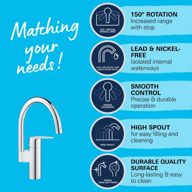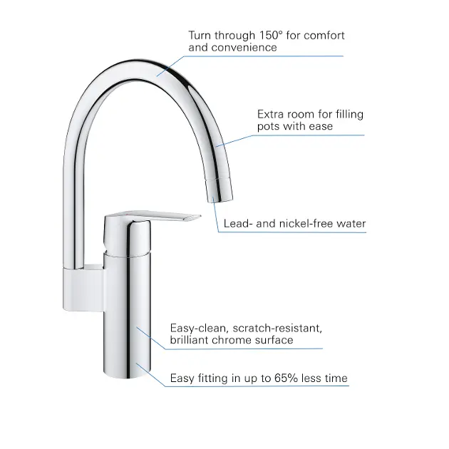 Páková kuchyňská baterie Grohe QuickFix Start vám poskytne pomoc při přípravě pokrmů i při úklidu po rodinném obědu či večeři. Jedná se o stojánkovou baterii s jednootvorovou montáží. Vyniká vysokou výpustí a variabilně nastavitelným omezovačem průtoku.