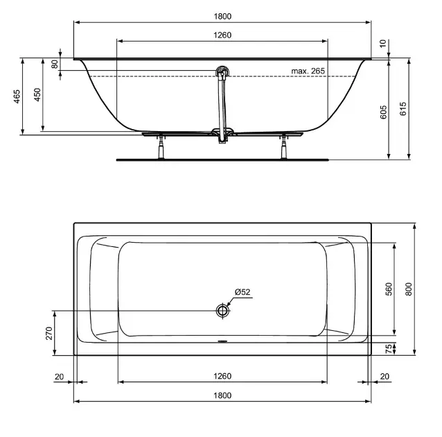 Nožičky a odtoková souprava nejsou součástí dodávky.