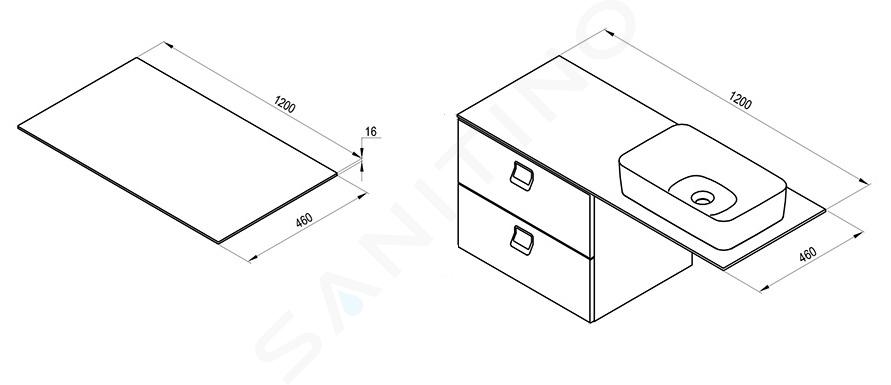 Pokud je deska umístěna na závěsnou skříňku z jedné strany, je nutné z druhé strany desku podepřít pomocí konzole desky Balance/Comfort 1200.