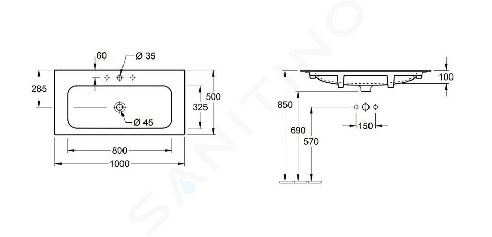 Nábytkové umyvadlo se skrytým přepadem, s CeramicPlus