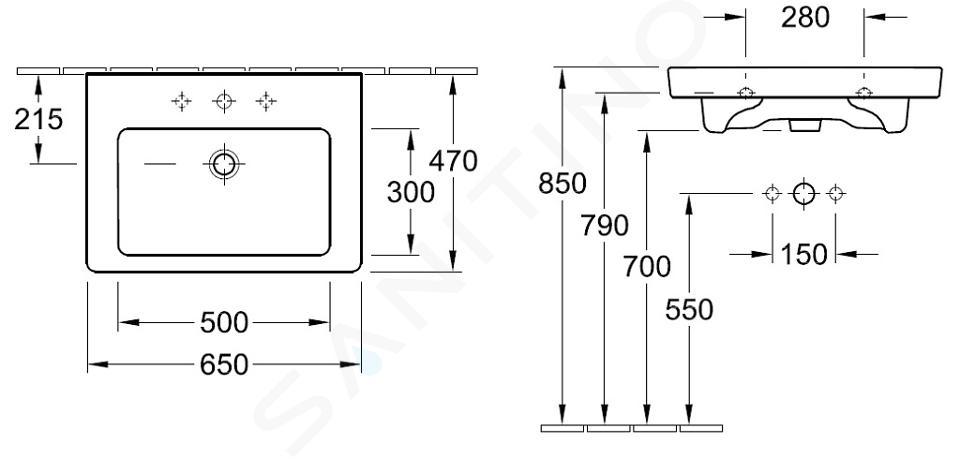 Umyvadlo obdélníkového tvaru s otvorem, s přepadem
